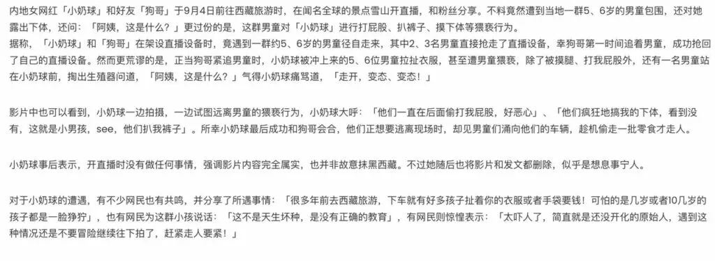 微博上拥有百万粉丝的网红小扔球,与好友一道前往西藏旅行。在著名的雪山景点进行直播,与粉丝分享旅途中的精彩瞬间。然而,意想不到的是,她竟然被一群当地五六岁的男童包围。这些男童不仅对她做出暴露生殖器的举动,还问她:“阿姨,这是什么?”。更为离谱的是,这些男童甚至对小扔球进行猥亵。