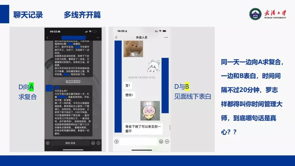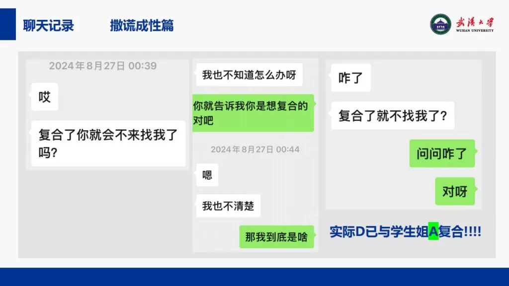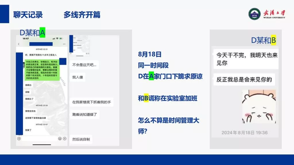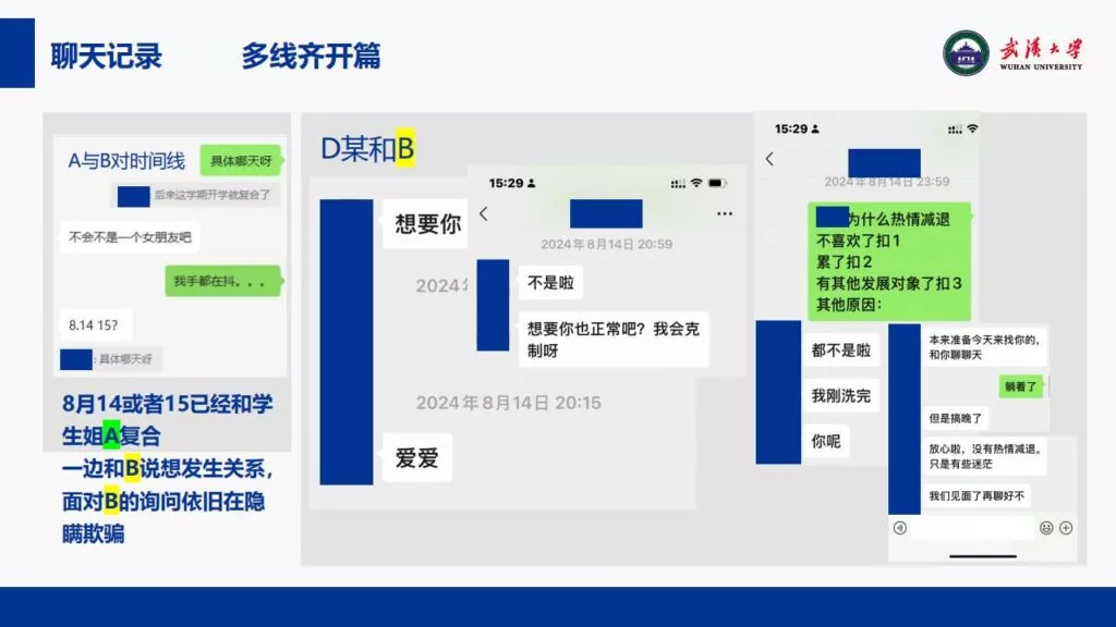 24页PPT揭露了武汉大学特聘副研究员的不当行为。他的师德败坏,令人失望,真可谓人渣中的人渣。同时,他与多名女生交往,向每位女生声称是真爱,简直可以称为顶级时间管理大师。他的一些经典言论更是毫无道德可言,彻底破坏了师德。他甚至扬言要“c满50个”。